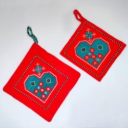 2 ST BRODERADE PANNLAPPAR/GRYTLAPPAR – HJÄRTAN – KORSSTYGN – RETRO/VINTAGE