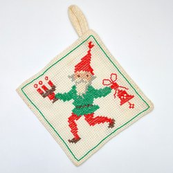 BRODERET POTTELAP/GRYDELAP – TOMTE – KORSSTING – RETRO/VINTAGE