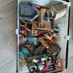 14 st gammel trækasse med Fransk plastjulepynt og perler, 1950'erne