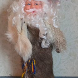 Jultomte i Renskinn, trä, tyg & plast - med vandringsstav & bjällra.