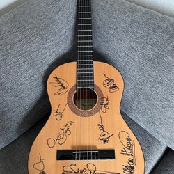 Gitarr signerad av skådespelarna på Vallarnas i Falkenberg.