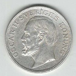 1 st Oscar ll, Silver-JUB-mynt, Valør 2 kr. år 1857 - 1907.