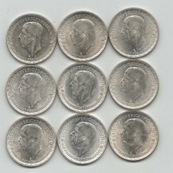 9 st Gustaf V, Sølvmønter, Værdi 2 kr. år 1942-43-44-45-46-47-48-49-1950.
