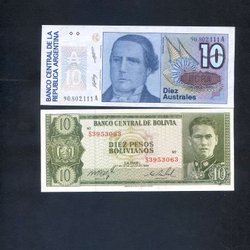 Sydamerika 2 ucirkulerede sedler 10Pesos Bolivia o 10Australes Argentina