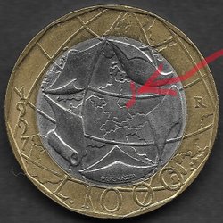 ITALIEN Meget kuriøse fejlprægning 1000 lire 1997 med forkerte Tyskland grænser