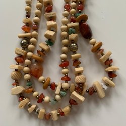 Halskæde i tre rækker, sten, metal og perler, i forskellige beige toner
