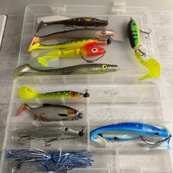 Fiskedrag og tilbehør i æske