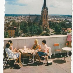 Ældre postkort "Hilsen Luleå" med 12 motiver fra byen. Posthuset i 1973