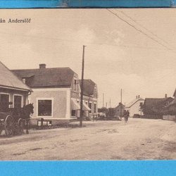 ANDERSLÖV. Gadebillede med hestevogn i en butik omkring 1920 (Trelleborg)