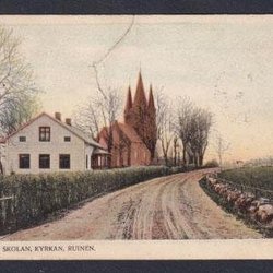 Husaby. Skolen, kirken, ruinen.