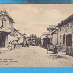 RÖDESUND (Karlsborg). Gadebillede med butikker og 3-hjulet motorcykel omkring 1915