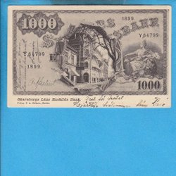 SKUBBETS. Seddelkort 1000 sedler med indskudt billede af Skaraborgs Läns Enskilda bank 1902
