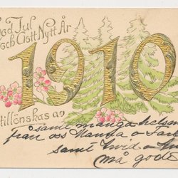 Årtalskort 1910 Relief Guldsiffror Granskog o nyponrosor bakomKV7 hörnv nere t v