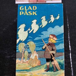 Et lille postkort. Pige fejer og ser på påskehekser underskrevet Ivar Lindberg