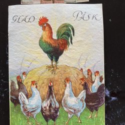 Lille postkort signeret Jenny Nyström Farverig Hane maler æg