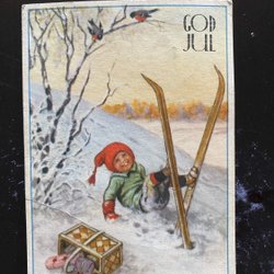 Lille postkort signeret Jenny Nyström Dreng med ski er faldet