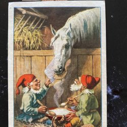 Lille postkort signeret Jenny Nyström Julemanden fodrer hvid hest