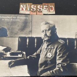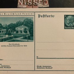 Hindenburg med naziflag over bygninger med rødt stempel på bagsiden