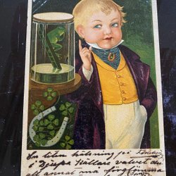 Mærkeligt postkort med en dreng og en frø i en krukke. løsesum 10 øre