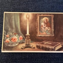 Fredfyldt Helligdag, Lysestage med brændende lys salmebog og blomster. E.W