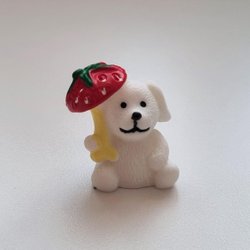 Hund med et jordbær som paraply. Miniature til dukkehuse, kighuller, togskinner mv