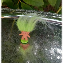 MINI dametrold stående på grøn tallerken med grønt hår mærket DAM Danmark på ryggen