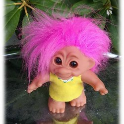 Dametrolden Dansk lykketrold større pink hår gul kjole mærket DAM DANMARK 1984