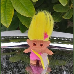 Dametrolden lille lykketrold gult hår pink kjole samlerobjekt VINTAGE RARITY