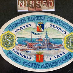 Smukt mærke Finska Socker AB. Fabrikken i Vaasa Finland. ca 10x15 cm
