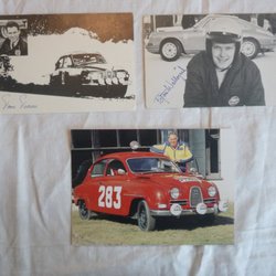 3 postkort SAAB 96/Tom Trana?/Björn Waldegård/Porsche 911/Erik Carlsson "på taget"