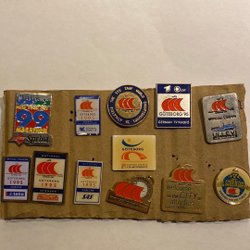 Pins med blå, grøn og gul cykel på ca. 1000 stk.