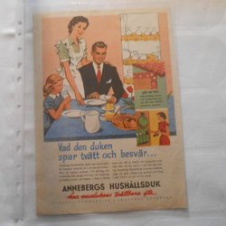Annebergs hushållsduk helsidesannonce fra 1950'erne – voksdug, retrofamilie