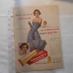 Colgate tandpasta 1950'erne helsidesannonce romantik lilla aftenkjole