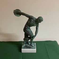 Skulpturen ”Diskuskastaren” i metal på marmorsokkel 40 cm høj