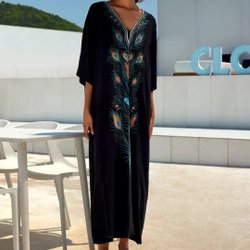 Magiskt-Vacker Kaftan. 100% viskose. Sort broderi i forskellige farver. Størrelse L. Ny.