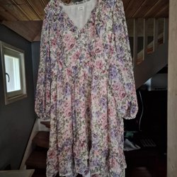 Nybegynder blomstret lilla, lyserød damekjole, langærmet kjole i str. XL.