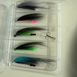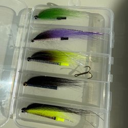Sæt med fluer i plastikboks til våd laks