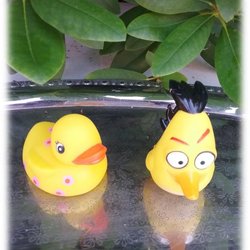 Angry Birds gummiand mærket Rovio og en anden med blomster på