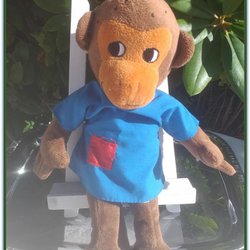 Herr Nilsson silkeabe med blå sweater Micki design Pæn stand