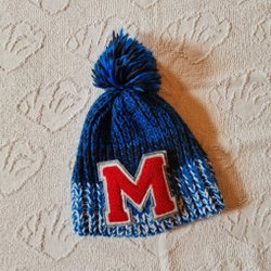 Blå, hvid strikhue str ca. 50 cm.