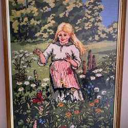 Håndbroderet gobelin billedtæppe billedramme pige blomstereng