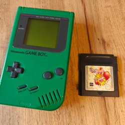 Gamboy color med ett spel och samlarlåda i trä