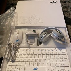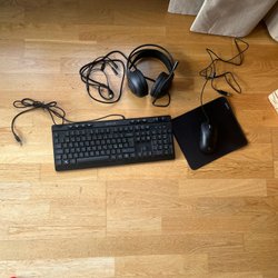 Tastatur, mus, musemåtte og hovedtelefoner
