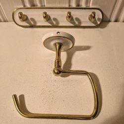 Vintage Smedbo knagerække/håndklædekrog og toiletpapirholder i messing og hvidt.