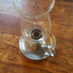 Flot håndlysestage med glasafdækning og metalfod og håndtag