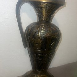 Vase, metal, egyptisk dekor i relief, omkring midten af 1900-tallet.