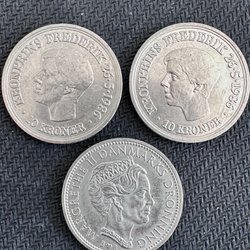 • Margrethe II: nutida mynt med Danmarks nuvarande drottning.