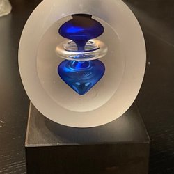 Det er en håndlavet glasskulptur med to røde hjerter indeni,