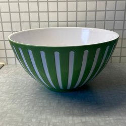 Stor skål i melamin, grøn-hvidstribet. En skål at blive glad af