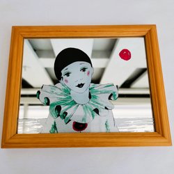 Håndmalet Pierrot-klovn på spejl – Indrammet vægkunst – 15x12 cm – Vintage stil